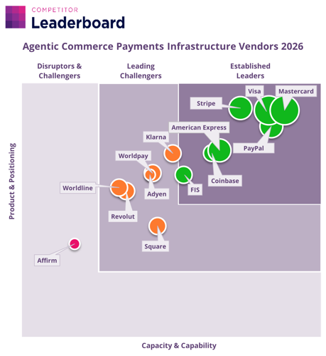 The Competitor Leaderboard analysed 14 leading providers, and ranked them based on criteria including specific capabilities enabling agentic flows and participation in agentic commerce protocols.