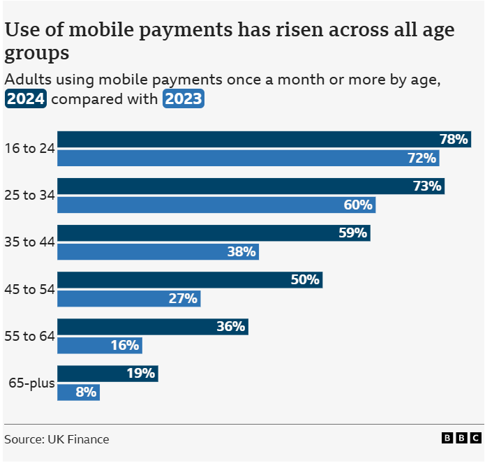 There was a surge in mobile wallet use for payments from 42% of UK adults in 2023 to 57% in 2024, according to UK Finance figures, BBC reports.
