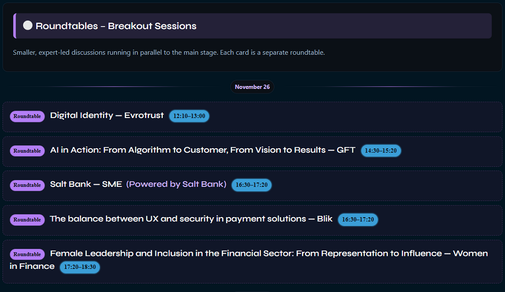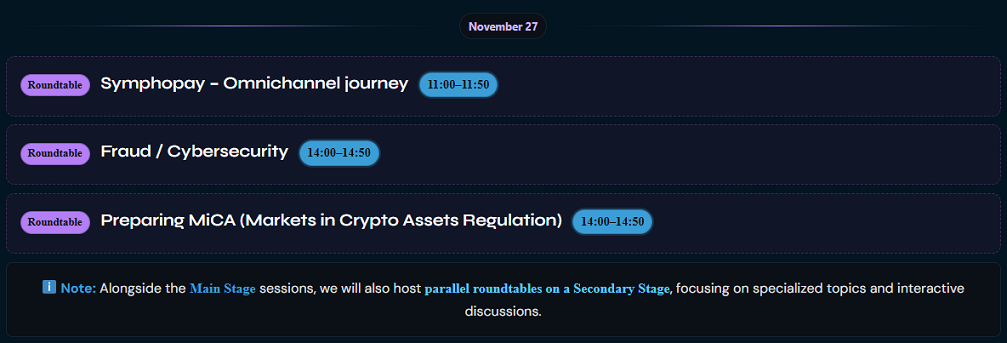 This year’s edition of Banking 4.0 brings a series of important firsts, including seven roundtables covering a wide spectrum of topics and industries—from digital identity and compliance (including the Markets in Crypto-Assets regulation) to artificial intelligence, payments, fraud, and cybersecurity (NIS2 and DORA – Digital Operational Resilience Act). Almost every roundtable is powered by a reputable company recognized in its field.