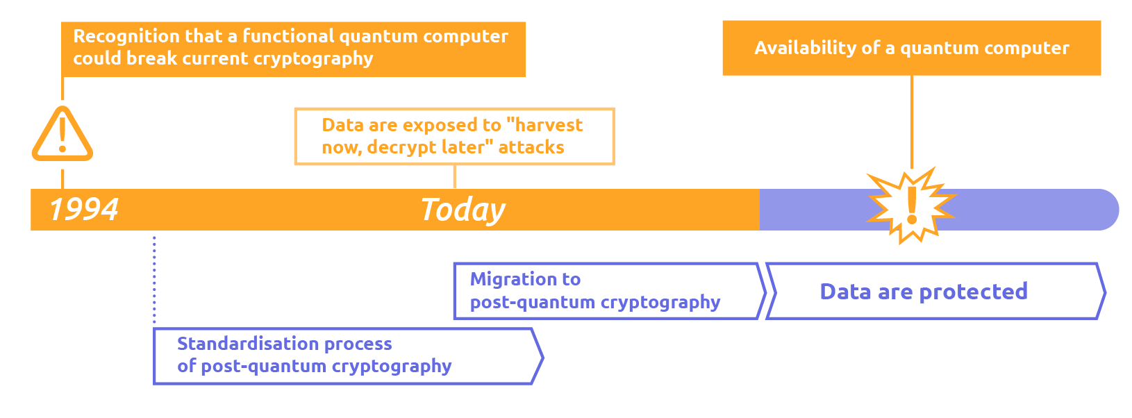 While it is still unclear when quantum computing technology might be adopted on a large scale, its potential as a cyber threat to the financial system is already a matter of concern. Malicious actors can intercept and store confidential, classically encrypted data with the intention of decrypting it later when quantum computers become powerful enough to do so. This means that data stored or transmitted today are, in fact, exposed to „harvest now, decrypt later” attacks by a future quantum computer.