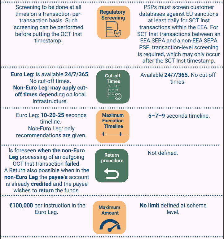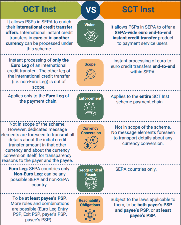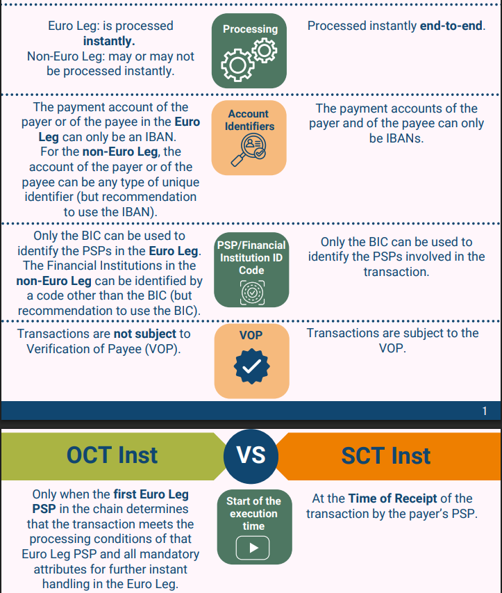 the European Payments Council (EPC) published two new documents detailing the key differences between the 2025 One-Leg Out Instant Credit Transfer (OCT Inst) and SEPA Instant Credit Transfer (SCT Inst) scheme rulebooks.