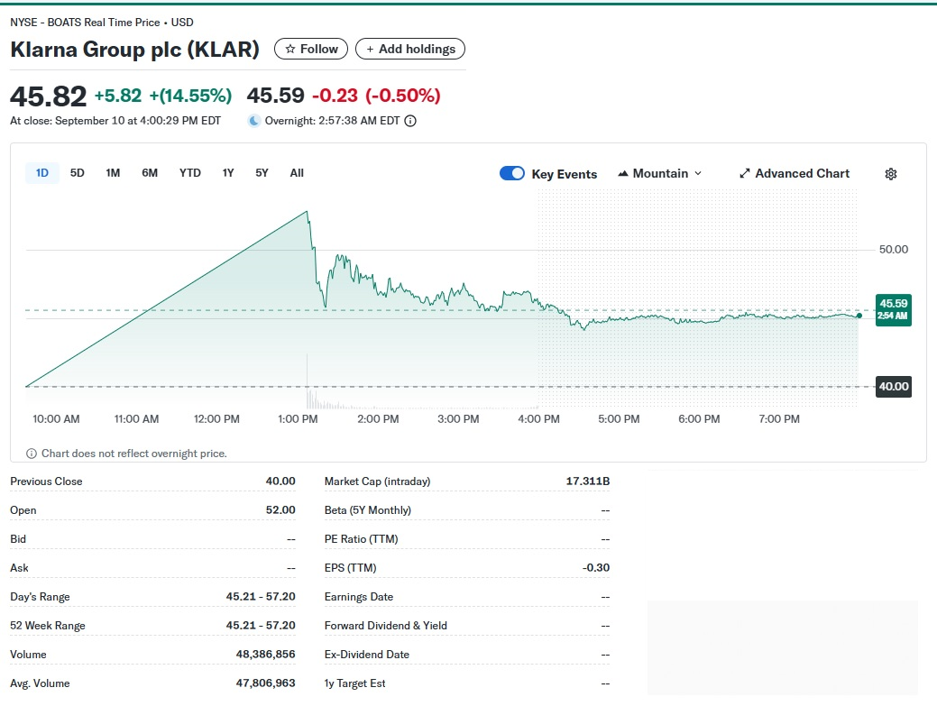 Klarna started trading at $52 early Wednesday afternoon, a day after its initial public offering price was set above the previously estimated range. Shares traded as high as $57.20 before closing up 15% at $45.82.