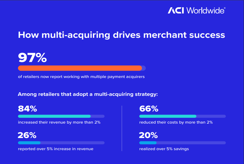 With payments emerging as a battleground for driving revenue growth, global retailers are accelerating their multi-acquirer strategies to stay ahead, according to a new survey conducted by ACI Worldwide and Payments Dive. The report Unlocking Opportunity: How Payments are Powering Merchant Growth reveals that 97% of global retailers are already working with multiple acquirers, and that 96% of those using two or more acquirers report an increase in revenue.