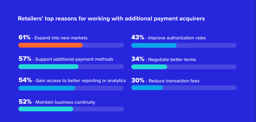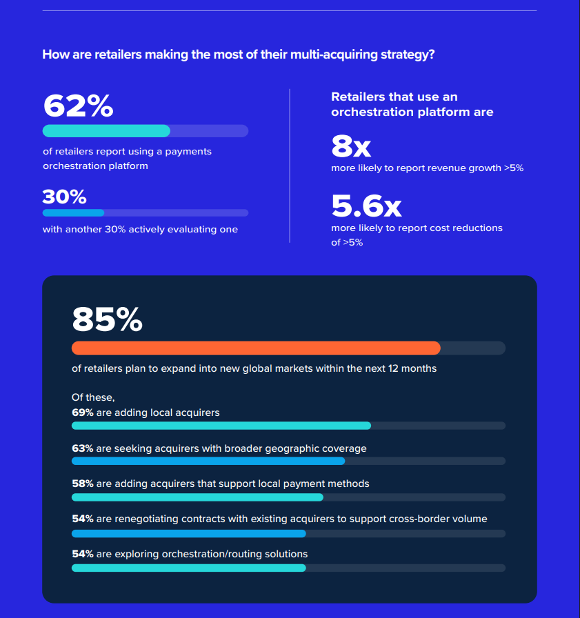 Drivers for Multi-Acquiring Strategy: 53% of tier-one global retailers say the need for additional payment options is the top objective when adding additional acquirers, followed by expansion into new markets (51%) and improving authorisation rates (48%). 86% of retailers report cost savings from working with two or more acquirers.