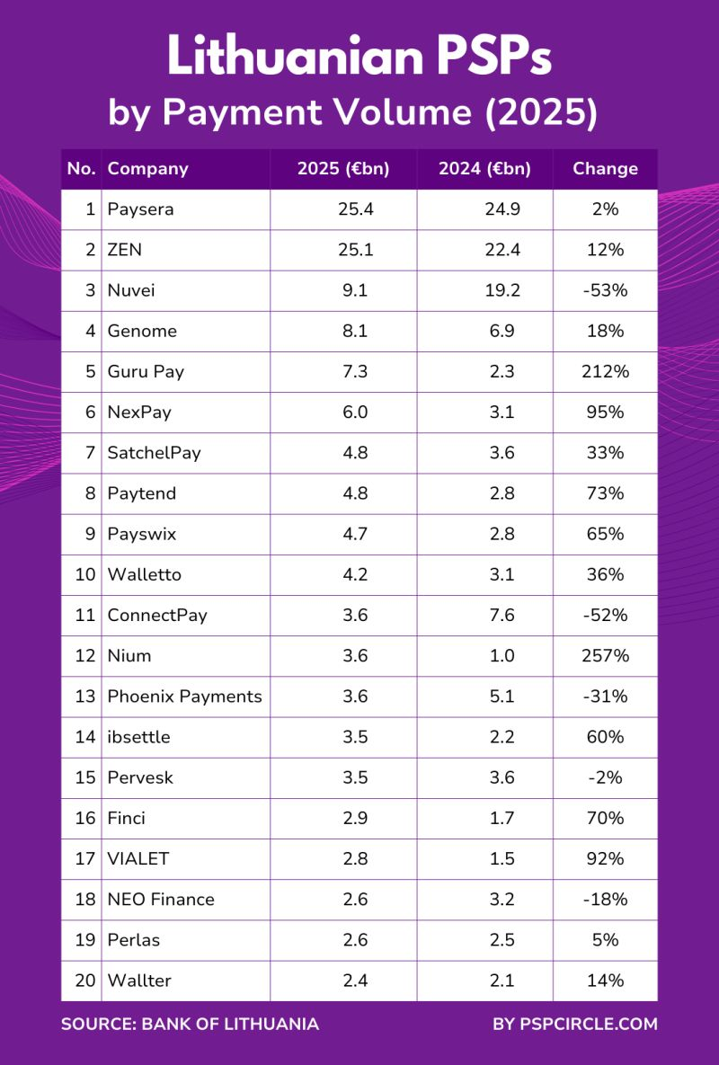 1. Paysera and ZEN are in a league of their own, each processing around €25bn last year.