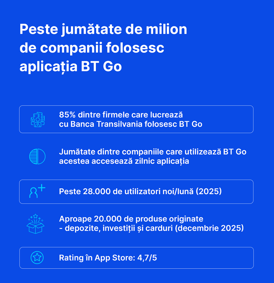 Peste 500.000 de companii folosesc aplicația BT Go, ceea ce reprezintă 85% dintre firmele care lucrează cu Banca Transilvania. „Jumătate dintre acestea accesează aplicația zilnic, confirmând rolul său de instrument esențial pentru gestionarea operațiunilor financiare și de business.” – potrivit comunicatului.